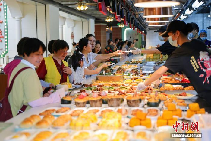 4月13日,海口骑楼老街的椰城喜鹿老爸茶店里,花样繁多的老爸茶小吃吸引顾客选购。 中新网记者 骆云飞 摄