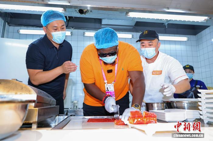4月13日,尼日利亚籍主播博密(OLUWABUNMI HENRY JIMOH)在海口骑楼老街的椰城喜鹿老爸茶店里,尝试制作红米肠粉。 中新网记者 骆云飞 摄
