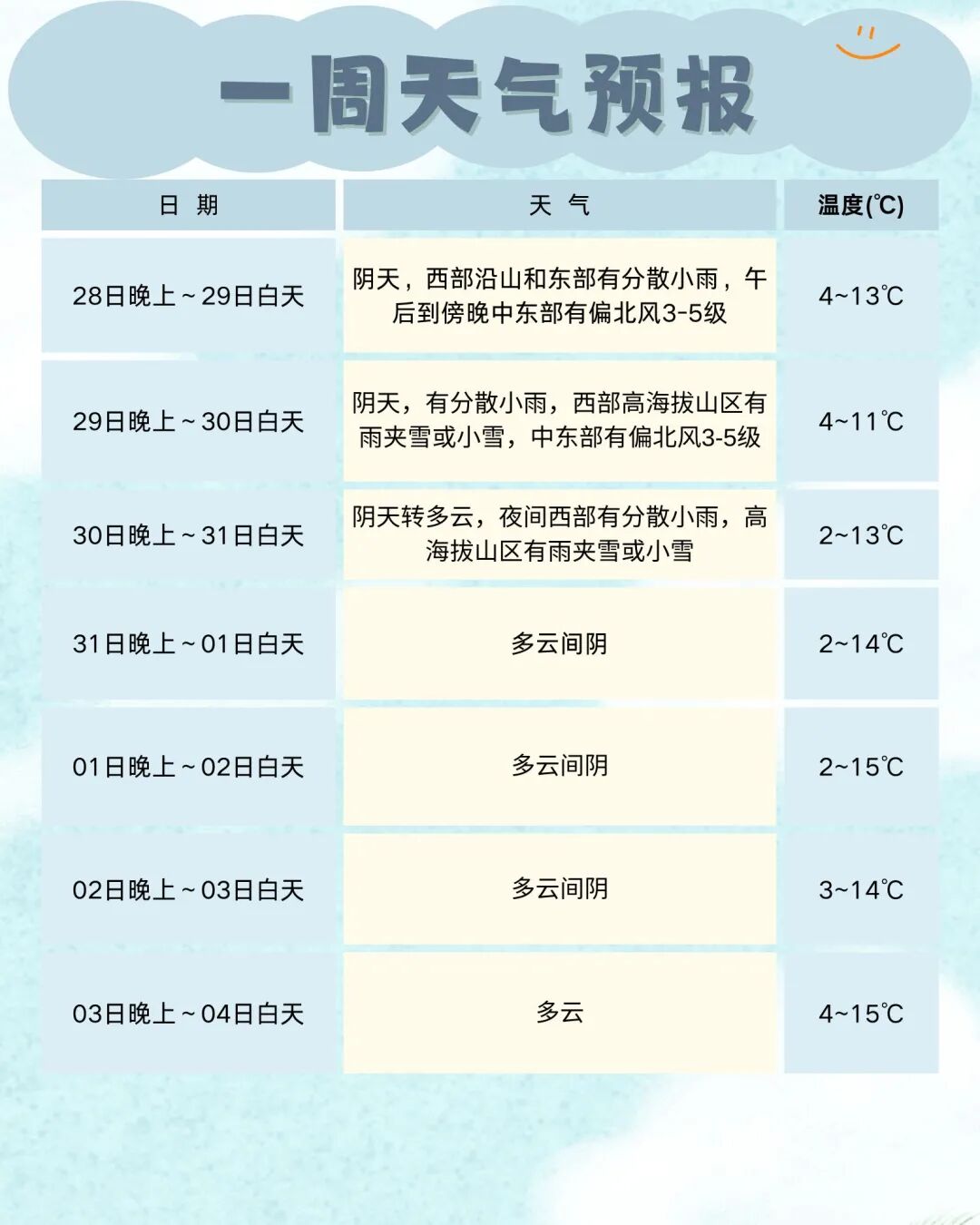 未来三天,四川盆地阴云回归,天气逐渐转差。盆地大部阴天有小雨,盆周高海拔山区有雨夹雪或雪;1月30日—31日,甘孜州北部东部、阿坝州大部、凉山州东北部阴天间多云有阵雪(雨),局地中到大雪;甘孜州中部南部和攀西地区大部多云到晴,午后风力较大。