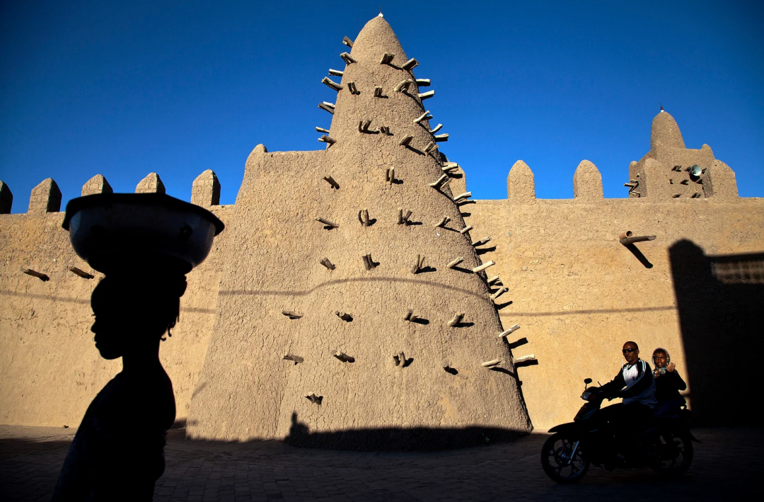 13 世纪,西非崛起了马里帝国,14 世纪在国王曼萨穆撒的带领下,走上巅峰,帝国皈依伊斯兰教,古城杰内和廷巴克图一度成为伊斯兰贸易和学术中心,阿拉伯人、意大利人还有犹太商人,都聚集在廷巴克图寻找人生财富。等将来他们不打仗了,大家有机会去廷巴克图,那里的津加里贝尔清真寺,那是撒哈拉以南最古老的清真寺,整个是土胚建筑,非常特别。