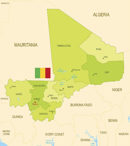 在这个尖尖角,东北是阿尔及利亚,西北是毛里塔尼亚,东接尼日尔、南边这一溜沿海分别是塞内加尔、几内亚、科特迪瓦还有布基纳法索。